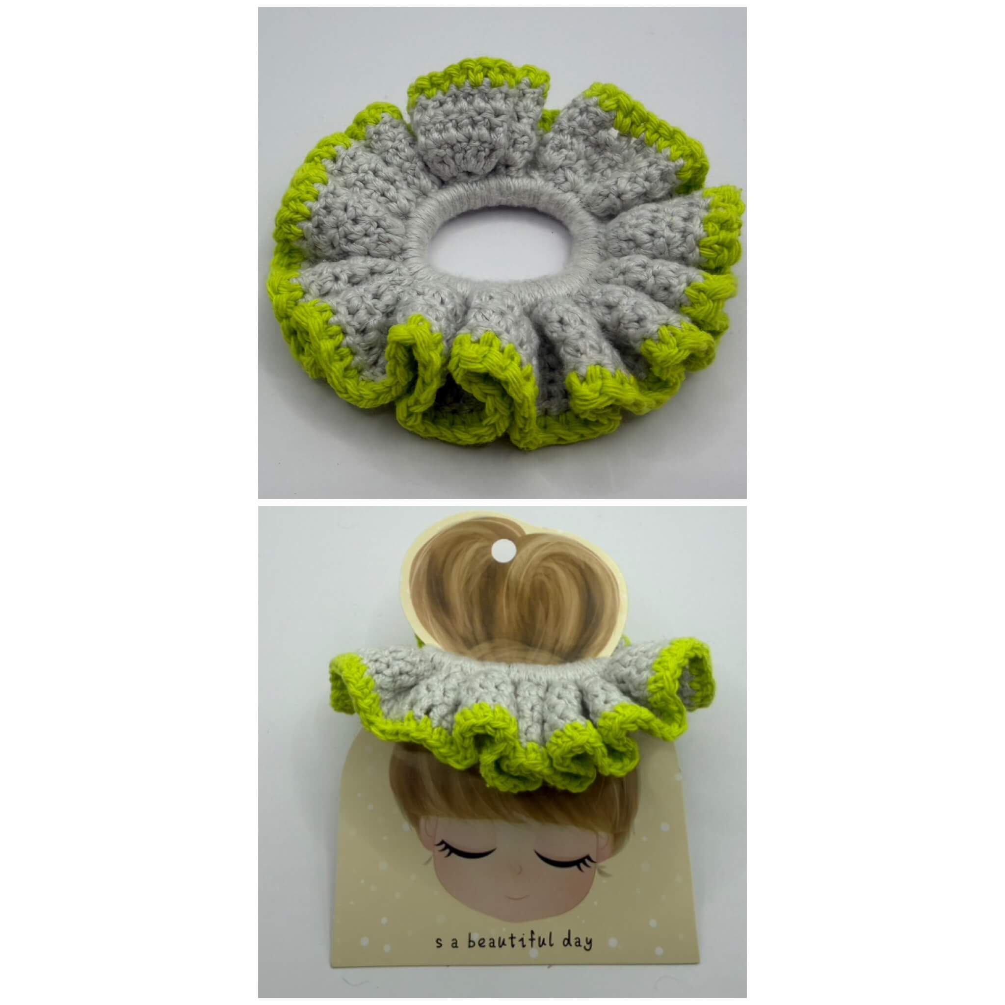 Apportez une touche d’originalité et de couleur à votre coiffure avec ce magnifique chouchou en crochet fait main. Confectionné avec soin, ce chouchou allie un vert lumineux à une finition ondulée avec un gris pour un effet élégant et tendance.